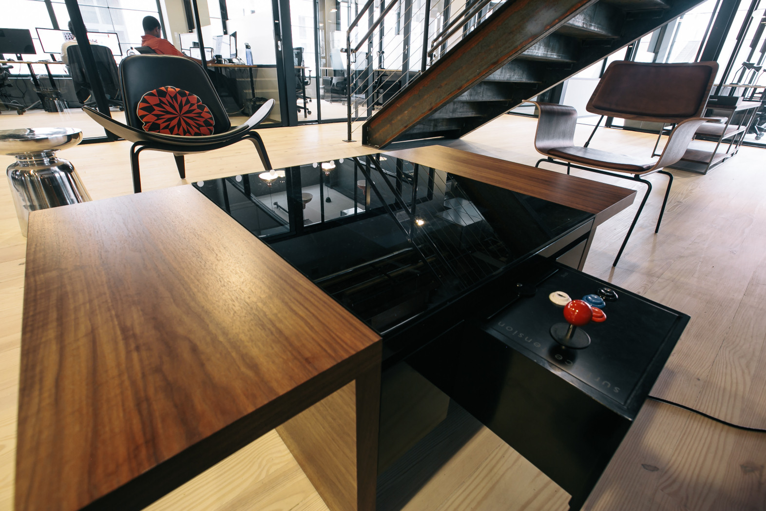 Genuine arcade joysticks and buttons provide the hands-on interface, integrated into black aluminium control panels.
